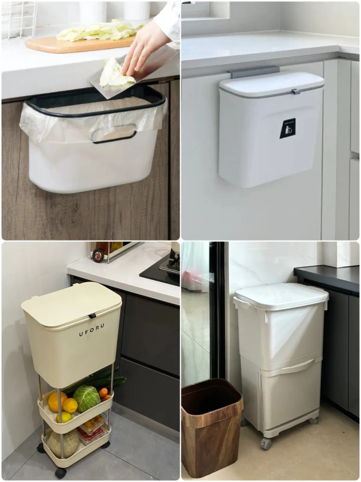 ▲悬挂式垃圾桶可以直接挂在柜门上,避免了弯腰扔垃圾的麻烦,极为方便;加高垃圾桶的高度与厨房台面持平,扔垃圾时无需弯腰,站着就能轻松完成,餐桌上的垃圾也能一并处理。免弯腰夹子