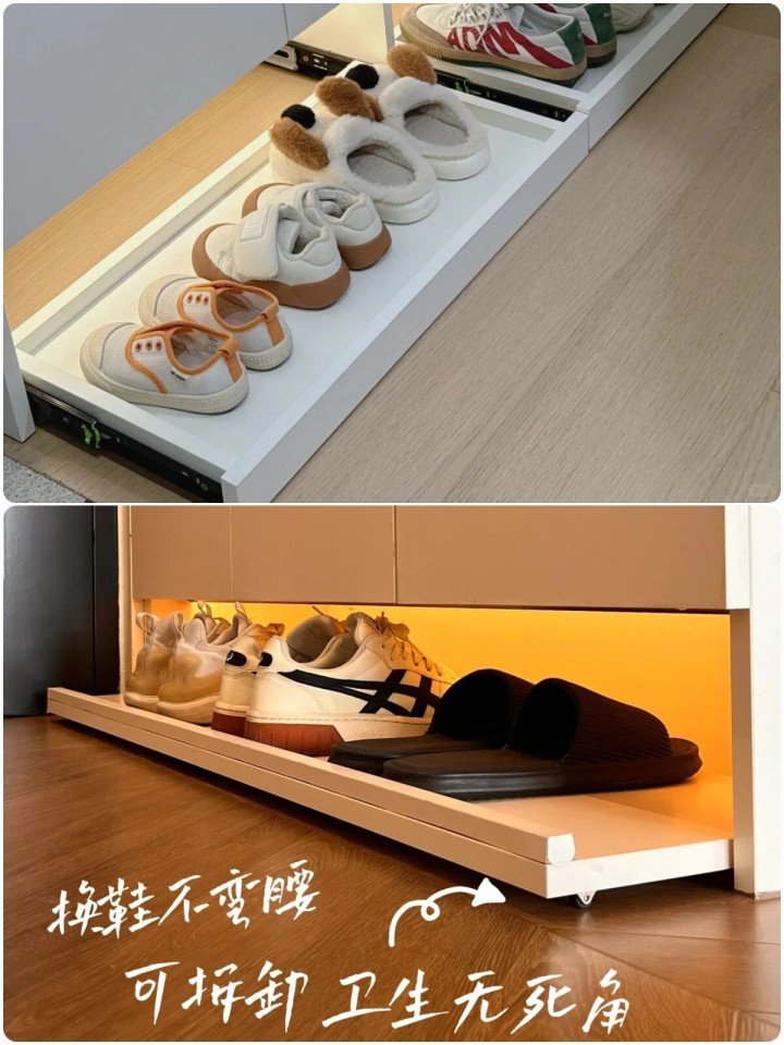 ▲利用悬空鞋柜设计原创“鞋柜踢脚抽”,方便收纳室内鞋和室外鞋,轻轻一推很丝滑,想换哪双换哪双,再也不用弯腰找鞋了!